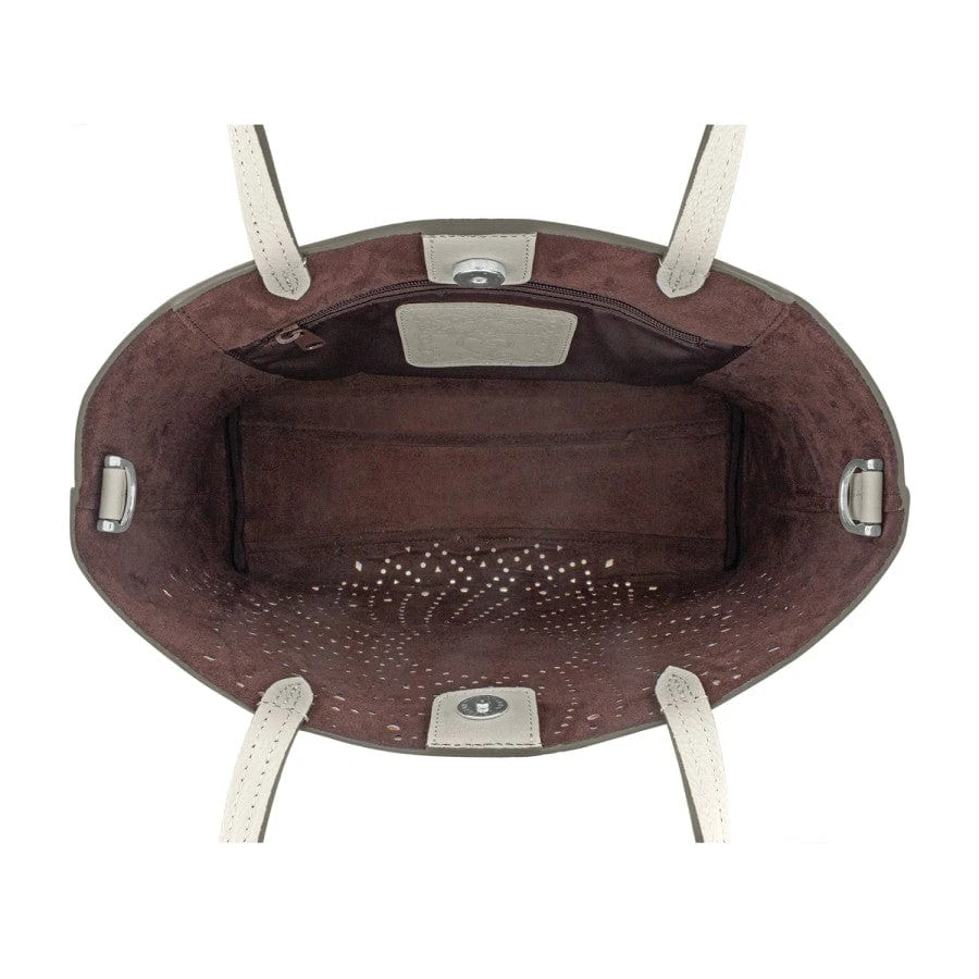 While still in keeping with the classic tone of Ferrara brand, this ultra-roomy tote bag is inspired by the ruggedness of California desert, cactus flowers in particular. The silver ball and golden barrel cactus are the main inspiration with their twisted segmented patterns and prickly textures. Backed with soft chocolate suede that peeks through the leather.