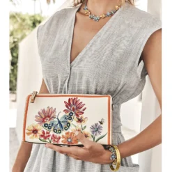 This crossbody pouch showcases embroidery to its fullest. Instead of painting, the threads blend and stitch to achieve a painted look. 57, 000 stitches take 3 hours to embroider and 14 thread colors!