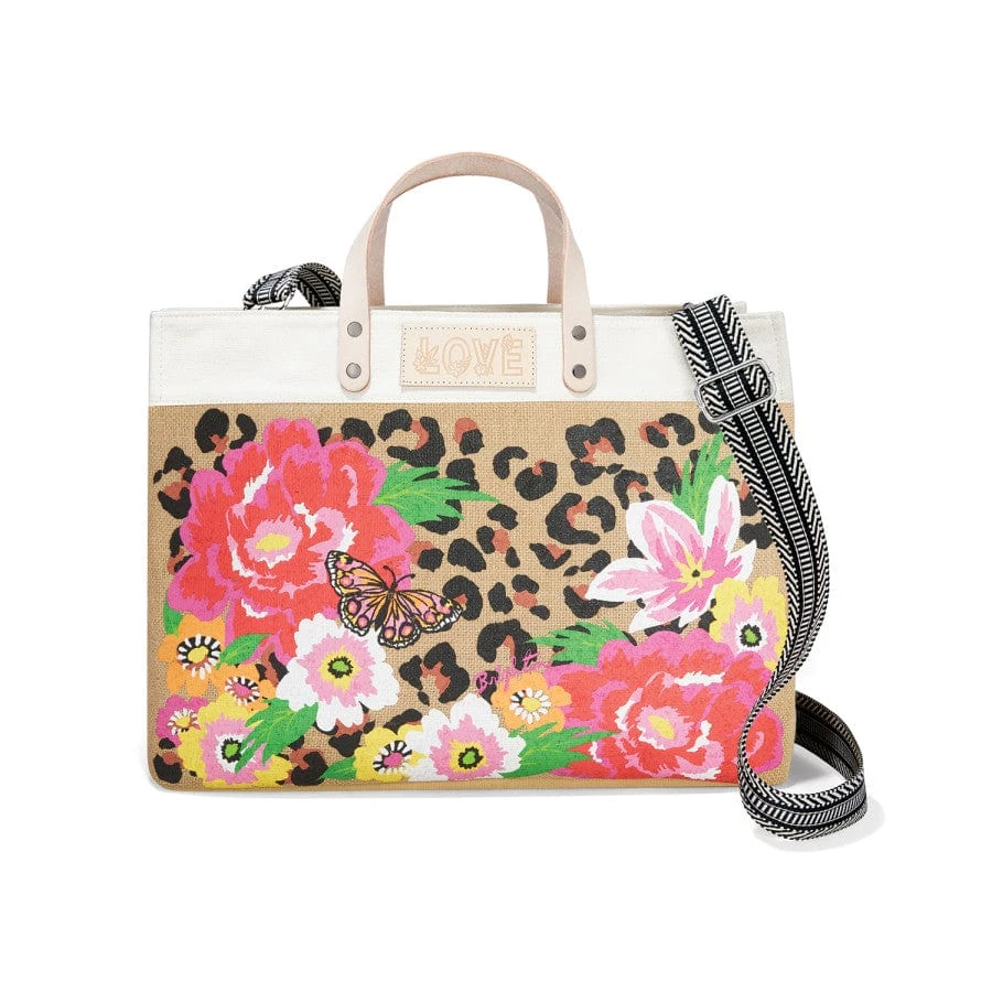 Mixing animal prints with florals is the new “It” pattern! This planet-friendly jute tote printed with our designer Catherine Hong’s hand-drawn and hand-painted artwork features leopard spots, giant camellia flowers, other pretty blooms and a butterfly. Its east-west silhouette gives you easy access to items inside and the cross-body strap lets you go hands-free. The perfect every-wearable bag!