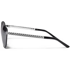 A delicate black metal frame with intricately sculpted woven silver decorates the temples on these Interlok Sunglasses. A dark mirrored lens gives them a contemporary feel. Very streamlined and lightweight.