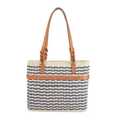 This artisan hand-woven tote in natural straw with maritime blue stripes has the perfect nautical accents – vegetable tanned leather accents and hand-braided straps and a bold silver-plated anchor. Gret-looking by land or sea!