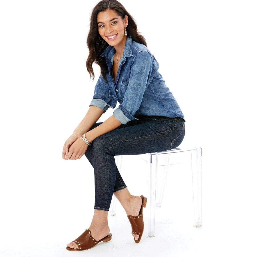 The hottest look in nailhead patterns outlines one of the coolest silhouettes of the season, sweeping high on the foot and curving back to the sole in an open toe flat mule.