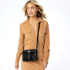 Everything in its place is this organizer’s motto, with a many-pocketed built-in wallet. A smooth ziptop close, along with a large zippered pocket on front, add security, while chic Pretty Tough motif adds style.