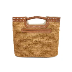 Trimmed in our signature Italian pebbled leather and studded with nailheads, this wheat-colored hand-crocheted raffia bag features beautiful wrapped leather handles and an adjustable crossbody strap.