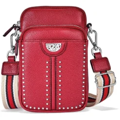 This crossbody is sporty-yet-chic with cool stud ornamentation and a wide webbing strap that has been dyed to match in a rich tri-color. ItÃs small and compact with two zipper pockets to fit your phone and so many more essentials plus a back slit pocket.